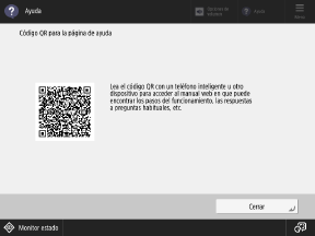 Esta pantalla aparece al pulsar [ Ayuda] en la pantalla [Inicio] o en otra pantalla. Puede escanear el código QR con un dispositivo móvil para ver la Guía de usuario (este manual) en el navegador web del dispositivo móvil.