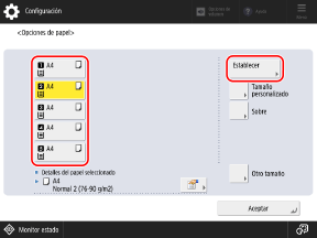 Seleccione el casete cuya configuración desee cambiar y pulse [Establecer].