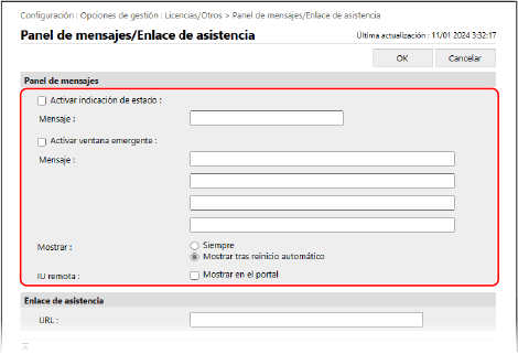 Si también desea visualizar el aviso en [Panel de mensajes] en la página del portal de la IU remota, seleccione la casilla [Mostrar en el portal] para [IU remota].