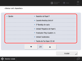 Puede comprobar los nombres de las unidades opcionales conectadas al equipo y las funciones opcionales.