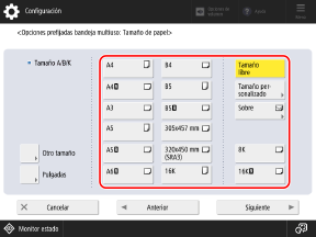 Para los tamaños de papel que aparecen al pulsar [Otro tamaño], consulte lo siguiente: