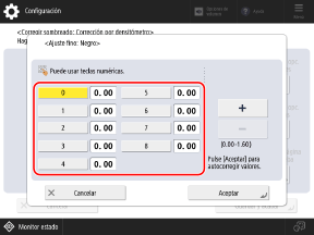 Mida las muestras de color del 0 al 8 de la página de prueba con un densitómetro e introduzca el valor de densidad medido para cada número.