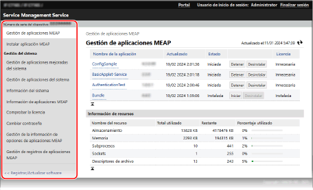 En esta pantalla, podrá instalar y gestionar las aplicaciones MEAP, así como gestionar el sistema MEAP.