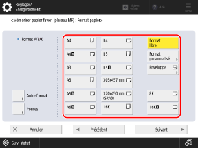 Pour les formats de papier qui s'affichent en appuyant sur [Autre format], voir :