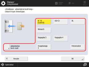 Appuyez sur [Alimentation bord long] ou [alimentation bord court] en fonction de l'orientation des enveloppes, puis sélectionnez le format des enveloppes.