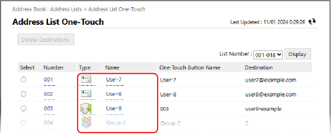 Você pode filtrar os destinos exibidos na lista selecionando o tipo de destino em [Type] ou a inicial do nome em [Initial] no canto superior direito da tela, e depois clicando em [Display].
