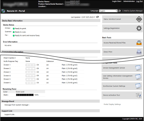 Quando você faz login na UI Remota, a página do Portal (página inicial da UI Remota) é exibida. Clique nos botões para verificar o status das operações da máquina, visualizar várias informações e alterar as configurações.