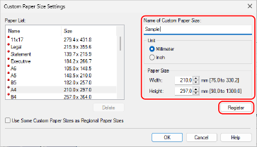Insira o nome do papel de tamanho personalizado e o tamanho de papel e clique em [Registrar].