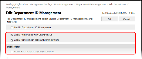 Desmarque as caixas de seleção [Allow Printer Jobs with Unknown IDs] e [Allow Remote Scan Jobs with Unknown IDs].
