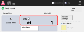 Na tela de seleção de arquivo em um espaço de armazenamento, selecione um arquivo e pressione [Print] para exibir a tela de configurações de impressão.