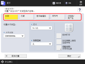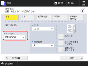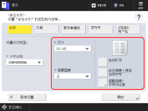 在 [安全水印] 屏幕上配置的设置会应用于样张打印件的字符格式。