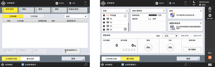 您可以選擇 [工作狀態/日誌] 檢查各項功能的處理狀態和歷史記錄以及消耗品和零件的剩餘數量。