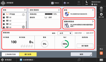 您可以顯示一個畫面同時檢查多個項目的狀態,例如紙張和碳粉的剩餘量、本機安全措施的狀態、排除傳真和列印過程中出現的問題所用的支援資訊,以及指定時間內的列印工作狀態和耗電量。