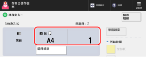目前設定要使用的紙張以及列印份數顯示在畫面中央。檢查這些設定以確保正確列印。