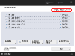 在控制台上,按下 [首頁] 畫面或其他畫面上的 [] 顯示 [計數器/裝置資訊] 畫面,並且檢查 IPv4 位址。