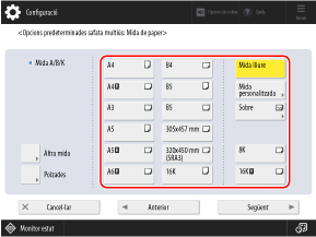 Si sempre carregueu el mateix paper a la safata multiús, podeu corregir-ne la mida i el tipus. Així evitareu que aparegui la pantalla de configuració de paper i us estalviareu la molèstia de configurar els paràmetres.
