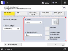 Indstillingerne, der er konfigureret på skærmen [Sikkerhedsvandmærke], anvendes på prøveprintets tegnformat.