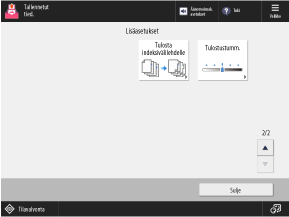 Määritä yksityiskohtaiset tulostusasetukset painamalla tämän näytön painikkeita. Kun olet määrittänyt tulostusasetukset, palaa tulostusasetusten näyttöön painamalla [Sulje].