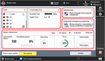 Można wyświetlić ekran w celu sprawdzenia stanu wielu elementów jednocześnie, takich jak pozostała ilość papieru i tonera, stan zabezpieczeń urządzenia, informacje pomocnicze dotyczące rozwiązywania problemów występujących podczas faksowania i drukowania, a także stan zadania drukowania i zużycie energii w określonym czasie.