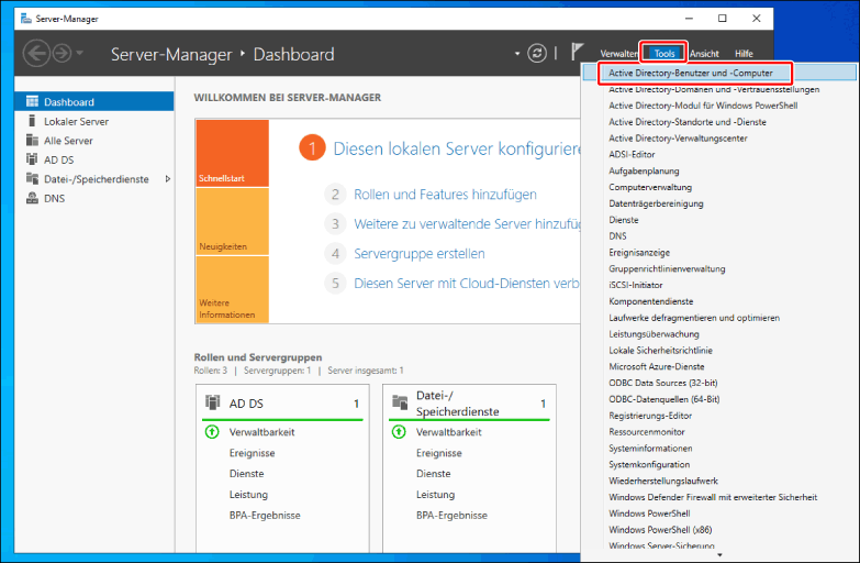 Wählen Sie [Active Directory-Benutzer und -Computer] unter [Tools] im Servermanager.