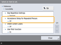 <Acceptance Delay for Repeated Presses> | <On>, <Off> <On>: 0.1 to 1.0 sec. | Yes | Yes | No | C | Settings/Registration Basic Information |