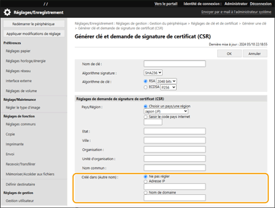 Quand <RSA> est sélectionné : <Longueur de la clé (bit)> : <512>, <1024>, <2048>, <4096> | Oui | Oui | Oui | Non | - | |