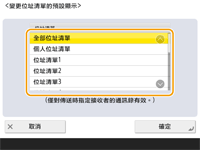 您可以指定在按下「傳真基本功能」或「掃描並傳送基本功能」畫面上的 <通訊錄> 時要顯示的通訊錄類型。