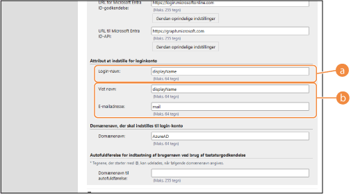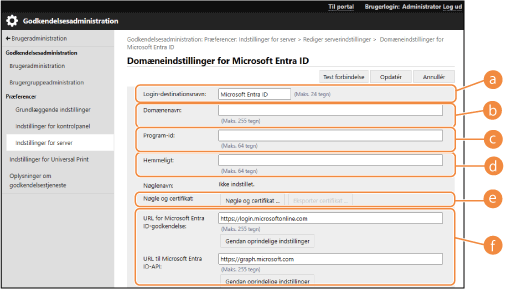 [URL for Microsoft Entra ID-godkendelse:] og [URL til Microsoft Entra ID-API:]Indtast URL'erne. Afhængigt af dit cloud-miljø kan det være nødvendigt at ændre indstillingerne.