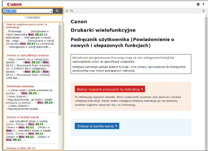 Szukanie poprzez wpisanie wersji jako słowo kluczowe (np. „Wer. 2.04”) powoduje wyświetlenie listy stron, które zawierają to słowo kluczowe. Następnie możesz przeszukiwać wyświetlone strony.