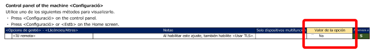 Configure las opciones del panel de control como se indica en “Valor de la opción” en la lista de opciones.