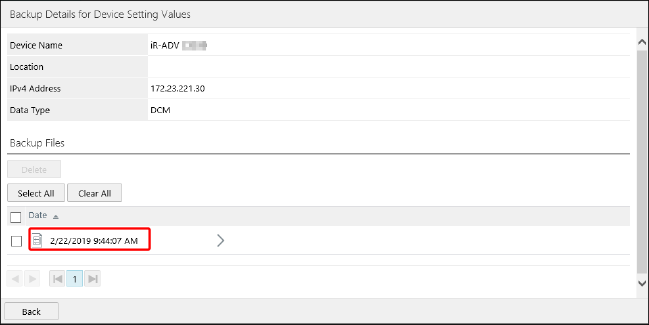 Select the desired printer on the [Devices] menu > [Backup Data] > [Device Setting Values] > [Backup Data Management for Device Setting Values] page.