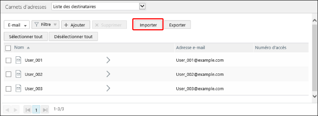 Prenez note de ce qui suit lorsque l’option [Créer une liste d'adresses en même temps] est activée. Même si une liste d'adresses portant le même nom est déjà enregistrée dans ce logiciel, une nouvelle liste d'adresses avec le même nom est créée. Aucune liste d’adresses n’est créée si aucun destinataire n’est inclus dans le fichier importé. Lorsqu'une liste d'adresses exportées depuis iW Management Console V3.x est importée, le type de liste d'adresses est « 1 touche » et le nom des listes d'adresses 1 touche est « OneTouch ». La « Liste d'adresses » n'est pas créée. |
