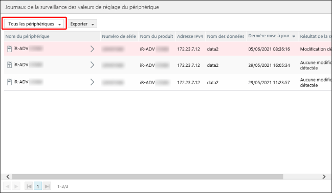 Exécutez les opérations requises dans la liste de la page [Journaux de la surveillance des valeurs de réglage du périphérique].
