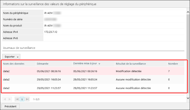L'historique de surveillance s'affiche dans la page [Informations sur la surveillance des valeurs de réglage du périphérique].