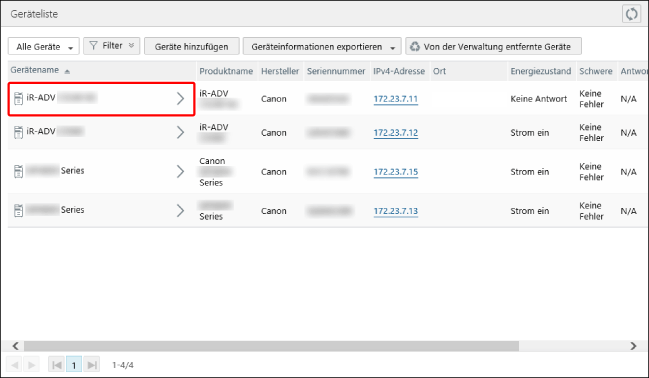 [Zu Gerätedetails] | Zeigt die Seite [Gerätedetails] an. Die Seite [Gerätedetails] entspricht der Seite, die angezeigt wird, wenn ein Gerätename auf der Seite [Geräteliste] angeklickt wird. |