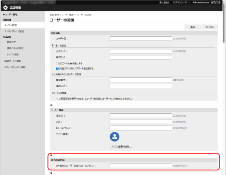 ユーザー情報を登録するときに、IPPプリントで使用しているユーザ名またはメールアドレスを設定できるようになりました。登録するユーザーとIPPプリントのジョブを関連付ける場合に設定します。