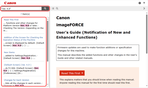 Searching by entering the version as a keyword (e.g. "Ver. 4.00") displays a list of pages that include that keyword. You can then search through the listed pages.