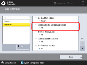 You can now specify the amount of time during which the machine does not accept the second and subsequent key inputs when a key on the on-screen keyboard is unintentionally pressed repeatedly. Configure this setting in cases such as when you intend to enter a single character, but the same character is entered repeatedly.