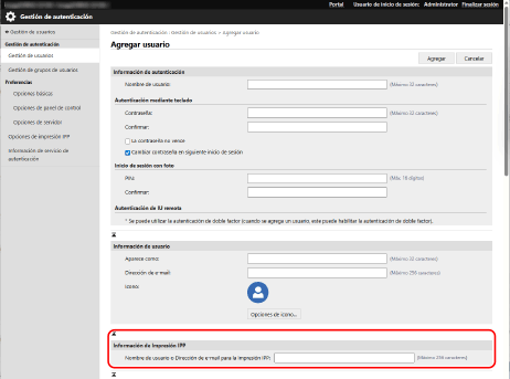 Al registrar la información de usuario, ahora puede establecer el nombre de usuario o la dirección de correo utilizada para la impresión IPP.