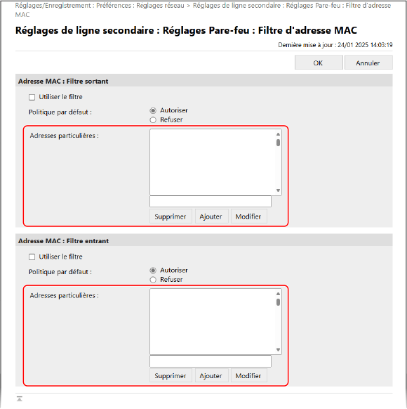 Vous pouvez désormais utiliser le filtrage par adresse MAC sur la ligne secondaire lorsque la machine est connectée simultanément à deux réseaux différents.