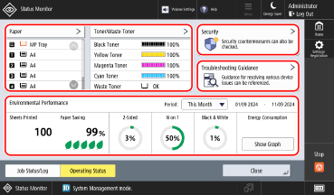 Agora você pode exibir uma tela para verificar o status de vários itens simultaneamente, como quantidade restante de papel e toner, status das medidas de segurança da impressora, informações de suporte para resolução de problemas que ocorrem durante o envio de faxes e impressão, e o status do trabalho de impressão e consumo de energia dentro de um período específico.