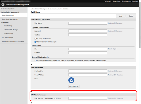 Adição de um item para definir informações de impressão IPP nas informações de usuário registradas no dispositivo local