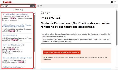 Vous pouvez saisir le nom d'une version en tant que mot-clé (par exemple "Ver. 4.00") pour afficher toutes les pages comprenant ce mot-clé. Vous pouvez alors poursuivre votre recherche dans les pages listées.