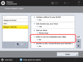 Vous pouvez maintenant définir s'il faut spécifier le [Nom] d'une destination enregistrée dans le carnet d'adresses de l'appareil comme objet lorsque vous envoyez un e-mail.