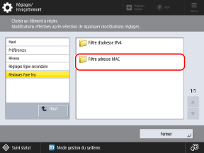 [Filtre adresse MAC] [Filtre sortant] [Utiliser le filtre] [Oui], [Non] [Politique par défaut] [Autoriser], [Refuser] [Mémoriser] [Adresse MAC] [Modifier] [Supprimer] [Filtre entrant] [Utiliser le filtre] [Oui], [Non] [Politique par défaut] [Autoriser], [Refuser] [Mémoriser] [Adresse MAC] [Modifier] [Supprimer] |