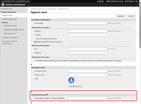 Quando si registrano le informazioni sull'utente, è ora possibile impostare il nome dell'utente o l'indirizzo e-mail utilizzato per la stampa IPP.