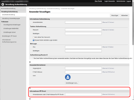 Bei der Registrierung von Benutzerinformationen können Sie jetzt den Benutzernamen oder die E-Mail-Adresse festlegen, die für den IPP-Druck verwendet werden.