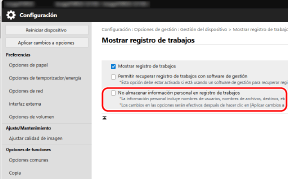 Ahora es posible prohibir la escritura de información personal como el nombre de usuario, el nombre de archivo y el destino en el registro de tareas y el registro de auditoría.