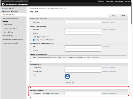 Afegir un element per establir la informació d’impressió IPP a la informació d’usuari registrada al dispositiu local
