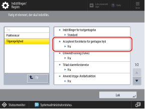 Du kan angive det tidsrum, hvor maskinen ikke accepterer den anden og de efterfølgende tasteinput, når der utilsigtet trykkes gentagne gange på en tast på skærmtastaturet. Konfigurer denne indstilling i tilfælde som, når du har til hensigt at indtaste et enkelt tegn, men det samme tegn indtastes gentagne gange.